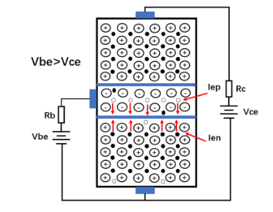 当发射结外加正向电压Vbe(正向偏置)时,由于发射区的掺杂浓度很高(三个区中最高),而基区的掺杂浓度最低,发射区的多数载流子电子将源源不断地穿过发射结扩散到基区(因浓度差而引起载流子由高浓度区域向低浓度区域的转移,称为扩散),形成发射结电子扩散电流Ien(该电流方向与电子运动方向相反)。