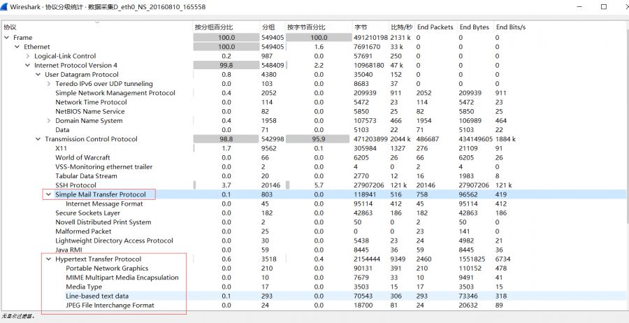 得到total.pcap,对它经行流量清洗,目标是过滤出,smtp,http流量