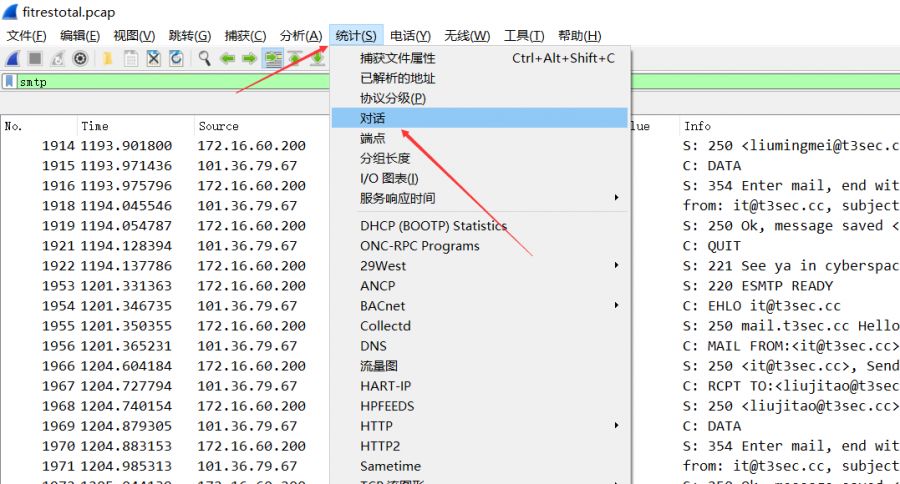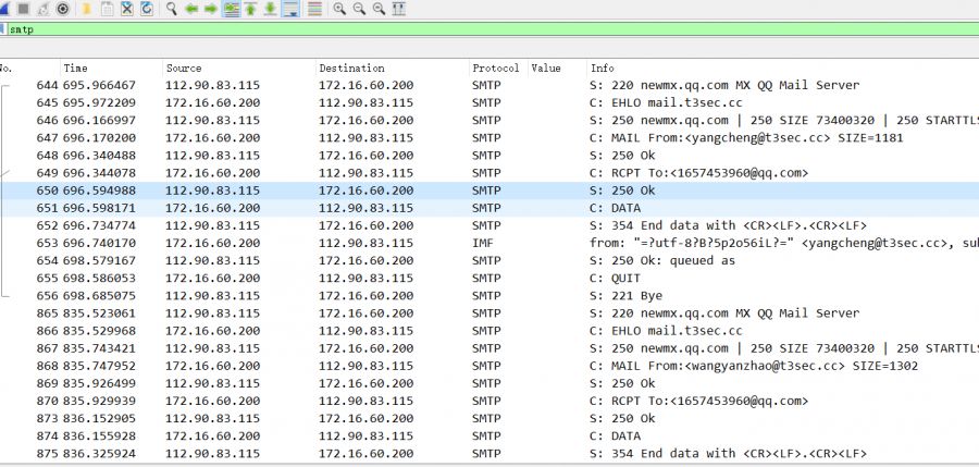 接下来先看smtp数据包,wireshark过滤条件为:smtp
