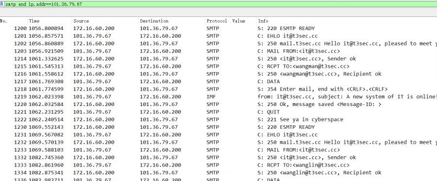 1).过滤条件为smtpand ip.addr==101.36.79.67