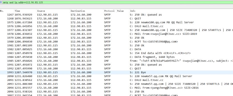 尝试过滤条件为smtpand ip.addr==112.90.83.115