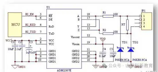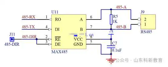市面上大部分的内置RS485的产品基本都是采用此类的方案,如下图4中的RS_EN引脚。具体的 实现方式是:在空闲器件,RS_EN 为低电平,MCU处于接收状态,在准备发送数据之前,MCU会拉高RS_EN,U1处于发送状态,发送完毕之后,RS_EN重新处于低电平,U1处于接收状态。