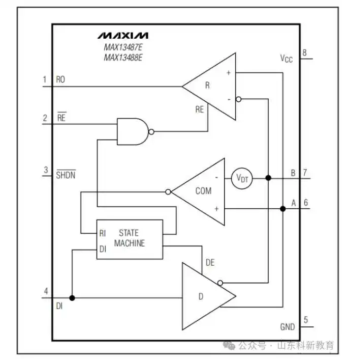 为了克服软件参与的方向控制不确定性,美信公司发布了宣称首款支持芯片自动换向的RS485芯片,如下图6,对比其他的RS485芯片,MAX16487的/RE引脚有两个用于: