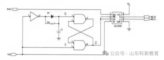 为了克服反相器换向的缺点,出现了一种由RS触发器控制的自动换向技术,如图5所示。这个电路的关键是反相器和RS触发器之间的由二极管、电阻、电容组成的充放电电路。在空闲状态下,485芯片仍处于接收状态。当TXD信号线上发送数据的低电平起始位时,反相器输出高电平,通过二极管为电容迅速充电,使RS触发器R端为高电平,S端为低电平,触发器输出高电平,把ISL3152E置于发送状态;当TXD信号线转换为高电平时,反相器输出低电平,电容通过电阻缓慢放电,使得R端暂时仍处于高电平状态,加上S端的高电平状态,使触发器的输出保持前面的高电平状态,485芯片仍处于发送状态。电容经过一段时间放电后,R端电压转变为低电平,则触发器输出低电平,把485芯片置回接收状态。通过选择电阻和电容值,我们可以控制放电速度,使得一个低电平的起始位足以在整个字节发送。此类方案参数一致性非常差,实际使用的都是技高人胆大的。