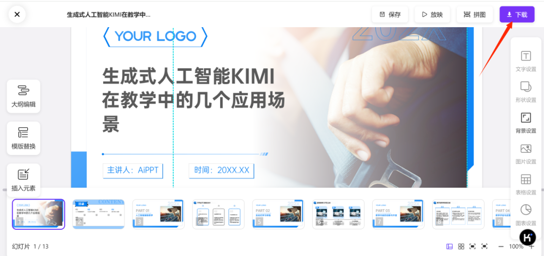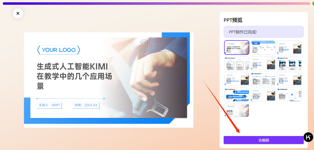 选择适合自己的PPT模板后,进入生成PPT界面,渲染后,点击编辑PPT页面,在线对PPT进行编辑,最终下载PPT,精美的PPT就这样属于你了。