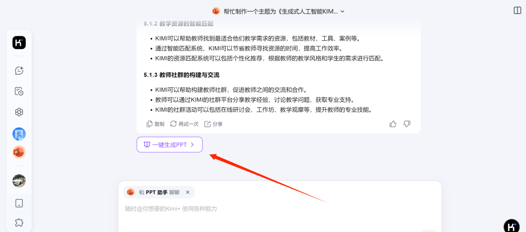 "让创意跃然纸上,Kimi助你轻松制作PPT。无论是演示、还是个人分享,Kimi都能为你提供灵感和文案支持。借助Kimi的智慧,让你的演示更加生动、专业。让Kimi成为你的设计伙伴,一起创造令人印象深刻的演示文稿。"