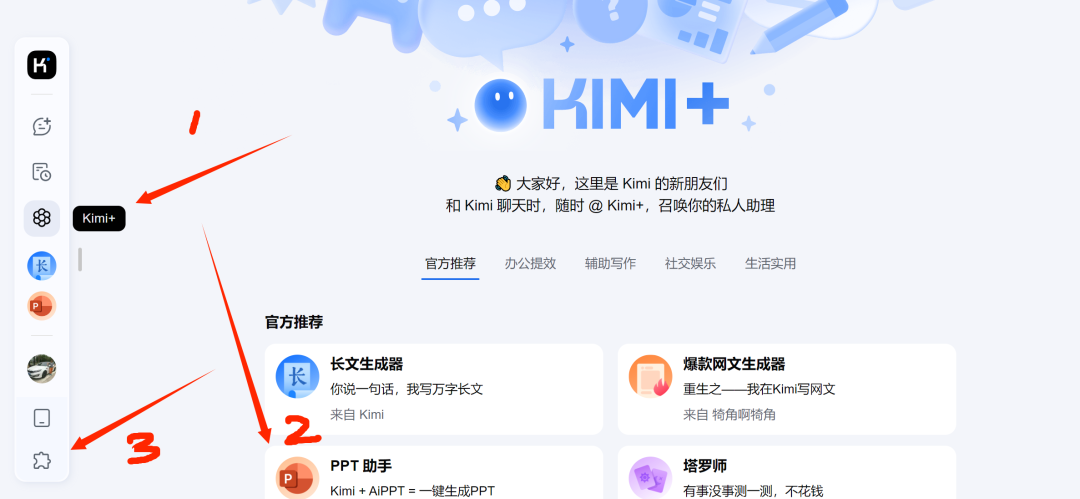 打开KIMI首页后,看看在KIMI+里有没有PPT助手,如果没有,请点击左下方的齿轮形状按钮,下载KIMI浏览器助手,安装插件。
