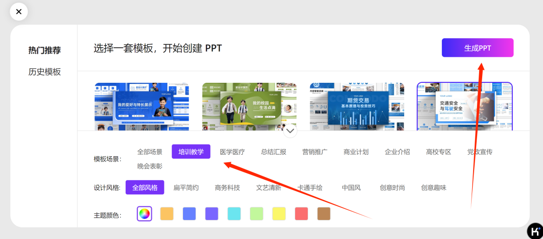 点击PPT助手,在聊天框内给出指令(指令越清晰,生成的内容会越好),然后选择自己喜欢的模板,就可以得到一份可修改的精美PPT啦!