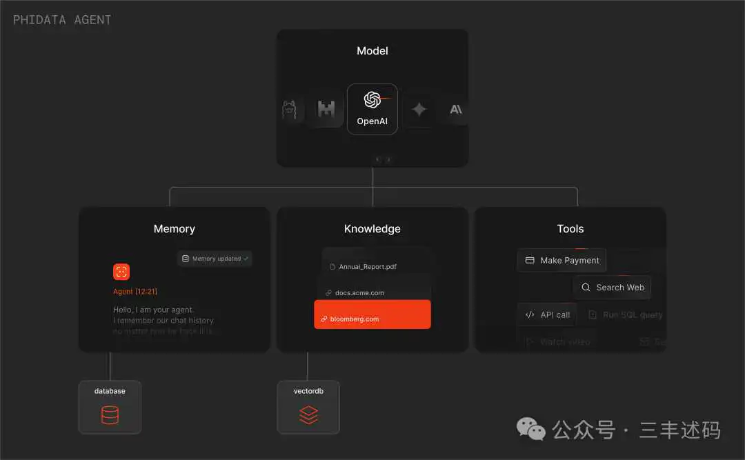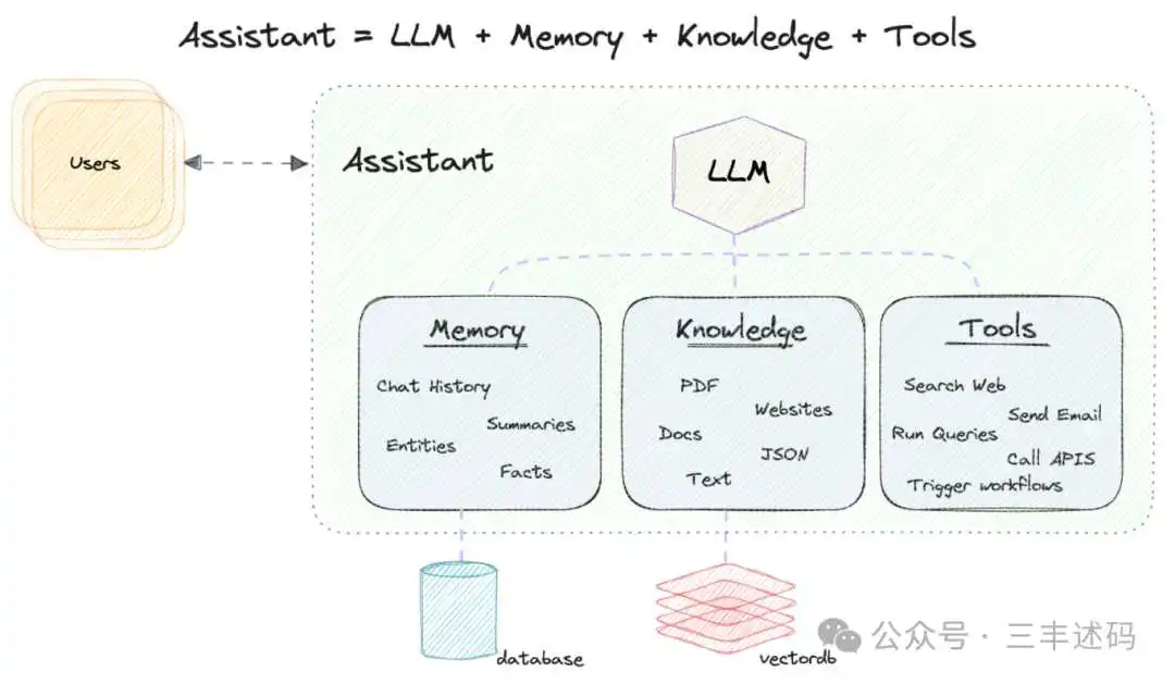 PhiData的设计理念如下,一个Assistant是以LLM为核心,加上长期记忆(Memory)、知识(结构化、非结构化)和工具(Tools,比如搜索、api调用等),这样就组成了一个完整的Assistant。