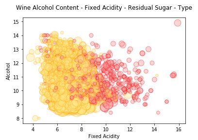 t = fig.suptitle( 'Wine Residual Sugar - Alcohol Content - Acidity - Type', fontsize= 14)
