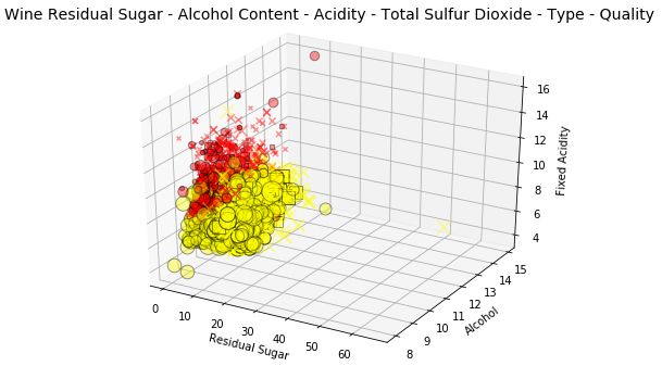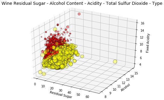 t = fig.suptitle( 'Wine Residual Sugar - Alcohol Content - Acidity - Total Sulfur Dioxide - Type', fontsize= 14)