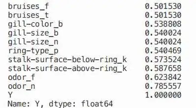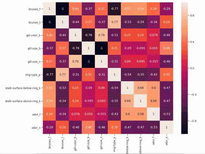 corr2 = Numeric_df[['bruises_f' , 'bruises_t' , 'gill-color_b' , 'gill-size_b' , 'gill-size_n' , 'ring-type_p' , 'stalk-surface-below-ring_k' , 'stalk-surface-above-ring_k' , 'odor_f', 'odor_n']].corr()