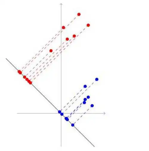 举一个直观的例子,如下图:红色和蓝色点代表数据分别属于两个不同类,与PAC最大化保持数据信息的思想不同,LDA会这样降维这两堆点