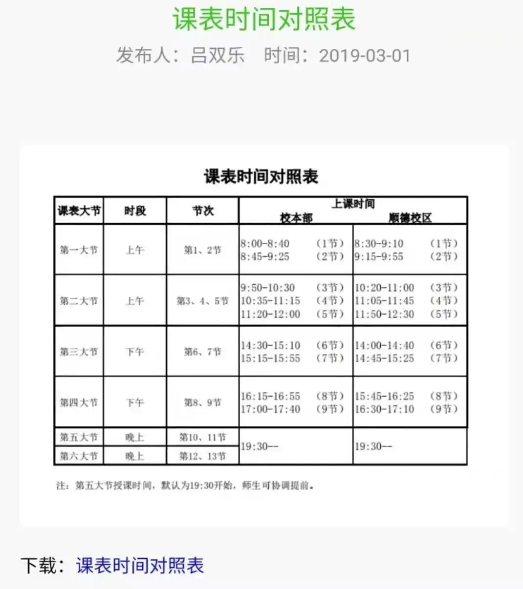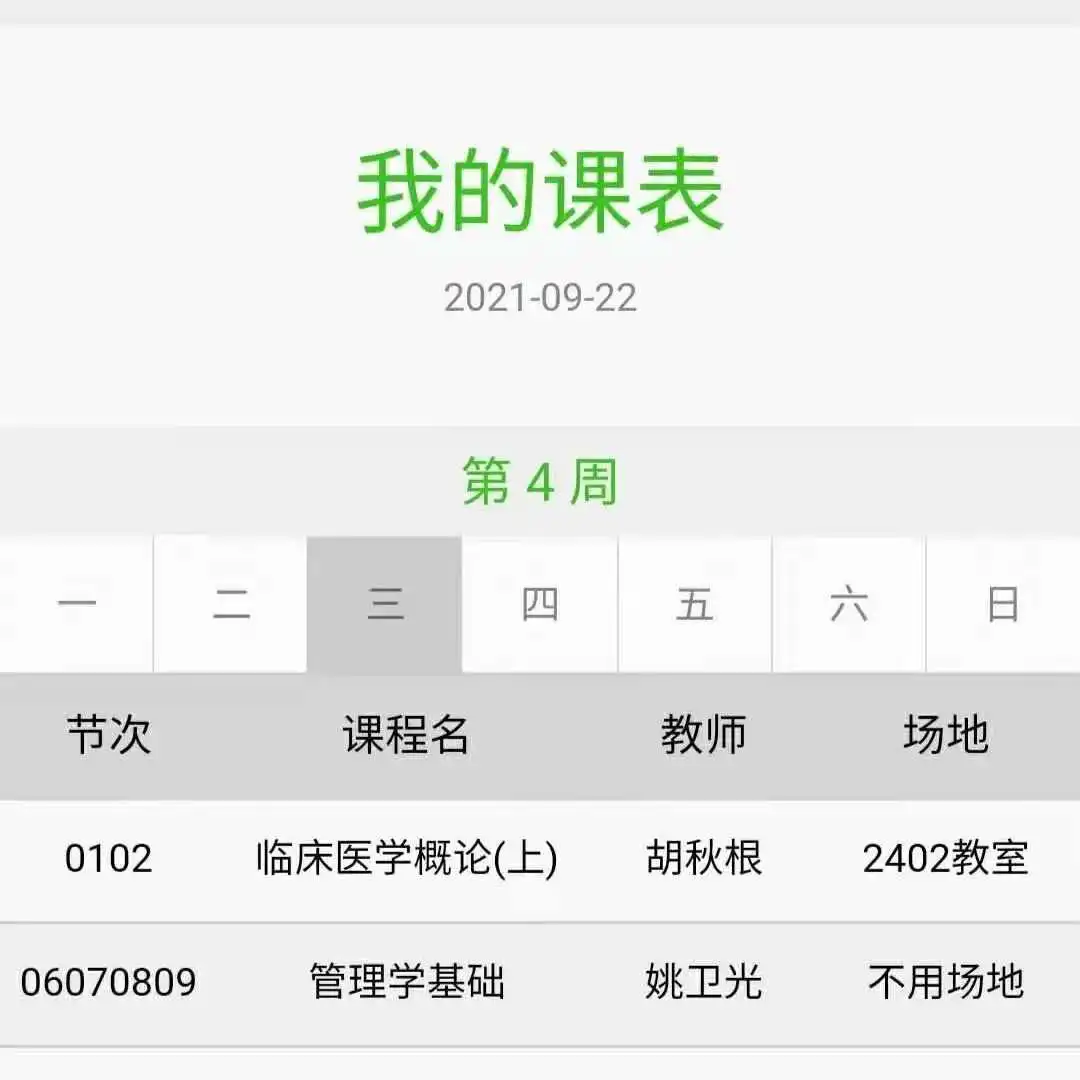 一、点击“我的课表”,将显示课表日期、周数、星期、节次、课程名、授课教师和场地。节次对应上课时间可参照教务系统公告置顶的《课表时间对照表》(《时间对照表》:是,我又出现了!)