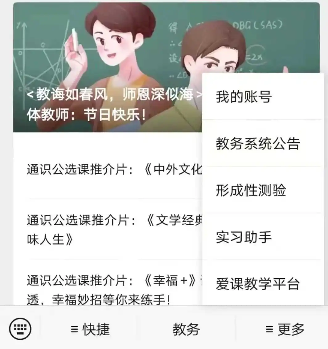 南医大教学右下方“更多”中包括“我的账号”、“教务系统公告”、“形成性测验”、“实习助手”、“爱课教学平台”等功能。
