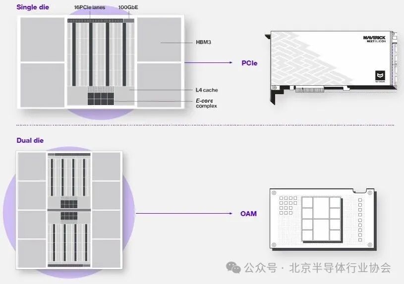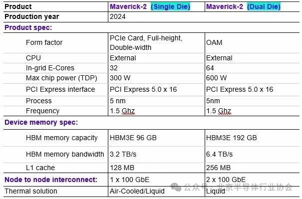 Maverick-2 的双芯片版本支持由 Microsoft 和 Meta Platforms 创建的开放计算加速器模块 (OAM) 外形尺寸,以便为数据中心加速器提供通用加速器插槽。英特尔和 AMD 在其加速器中使用 OAM 插槽;Nvidia 则不这样做。OAM 版本仅向外界公开总共 16 条PCI-Express 5.0 IO 通道,而不是 32 条。