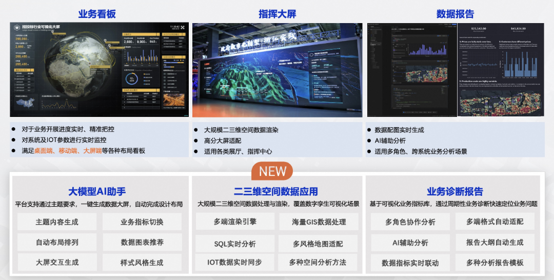 DataV为企业数字化管理、城市治理、交通运输、能源电⼒、⼯业制造、⾃然资源等领域的数字化管理提供了便利的⽀撑,帮助⾏业客户与⽣态伙伴实现研发效率提升、数字化建设成本降低,促进企业内部数字管理系统集成与解决⽅案创新。DataV应用场景覆盖数据看板、指挥大屏、数据报告等各种业务场景;同时最近推出大模型AI助手、二三维空间数据应用、业务诊断报告等新功能,满足不断增长的行业新业态需求。