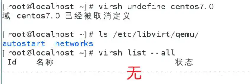 先闭关在删除[root@localhost ~]# virsh shutdown centos7.0域 centos7.0 被关闭[root@localhost ~]# virsh undefine centos7.0域 centos7.0 已经被取消定义[root@localhost ~]# ls /etc/libvirt/qemu/autostart networks