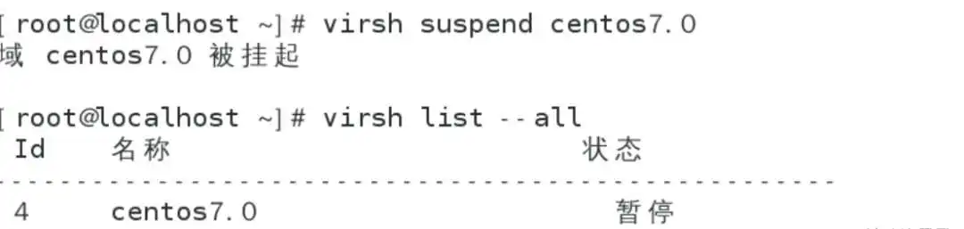 [root@localhost ~]# virsh suspend centos7.0域 centos7.0 被挂起[root@localhost ~]# virsh list --allId 名称 状态----------------------------------------------------4 centos7.0 暂停