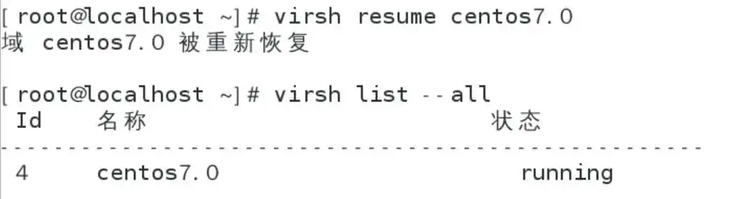 [root@localhost ~]# virsh resume centos7.0域 centos7.0 被重新恢复[root@localhost ~]# virsh list --allId 名称 状态----------------------------------------------------4 centos7.0 running