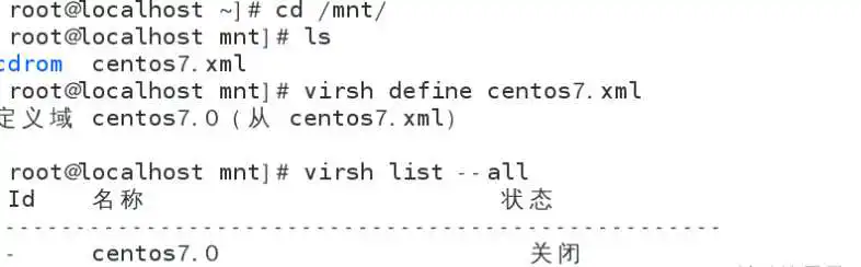 [root@localhost ~]# cd /mnt/[root@localhost mnt]# lscdrom centos7.xml[root@localhost mnt]# virsh define centos7.xml定义域 centos7.0(从 centos7.xml)