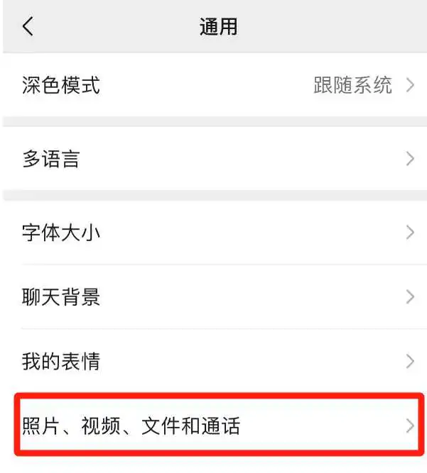 找到“通用”选项,点击“照片、视频、文件和通话”,然后关闭“自动下载”