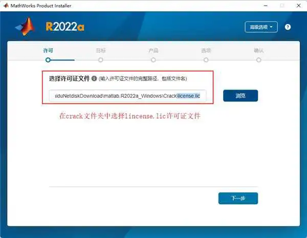 6、当被要求“选择许可文件”时,从crack文件夹中选择文件“license.lic”