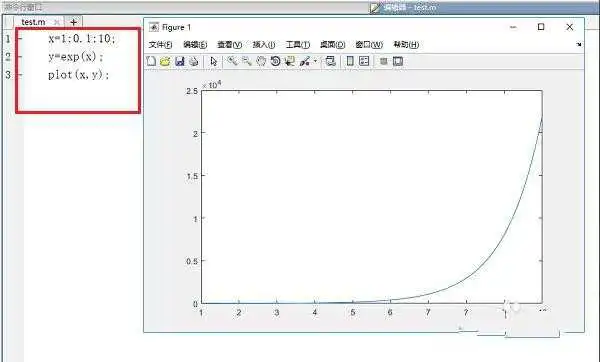 5、第五步输入y=exp(x),运行m文件,可以看到画出了指数函数图像,如下图所示: