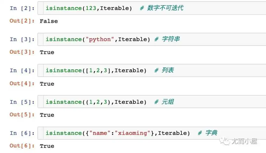 小结:在Python常见的数据对象中,只有数字是不可迭代的,字符串、元组、列表、字典等都是可迭代的