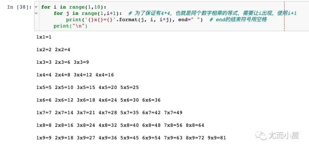 for j in range(1,i+1): # 为了保证有4*4,也就是同个数字相乘的等式,需要让i出现,使用i+1