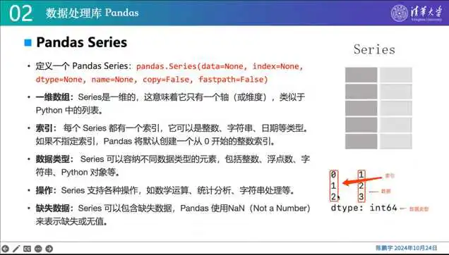 主要介绍了数据处理库P及其核心数据结构,包括一维的series和二维的data frame。P是一个基于Numpy的数据处理库,方便进行数据处理。series和data frame分别对应于一维表和二维表,类似于Excel表格。P还提供了一些数据清洗、数据分析、索引和选择函数。此外,还介绍了如何在P中创建series和data frame,以及如何使用这些函数进行操作。
