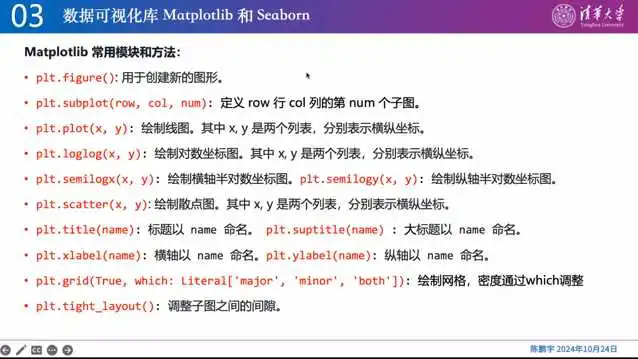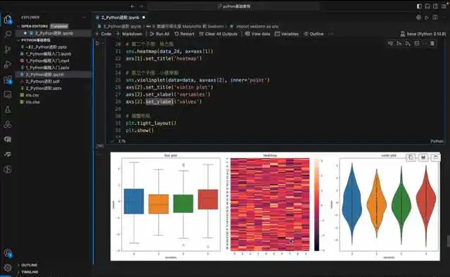 主要介绍了如何使用Python的matplotlib库进行数据可视化。首先,通过plot函数绘制线图,可以传入横纵坐标列表,如元组。然后,可以使用scatter函数绘制散点图,参数与plot函数相同。此外,还可以添加坐标轴名字、标题、网格等元素。为了使子图之间不重叠,需要使用tight layout调整间隙。最后,介绍了基于M library构建的高级界面,如象限图、热力图、小提琴图等,这些都可以通过一行代码实现。