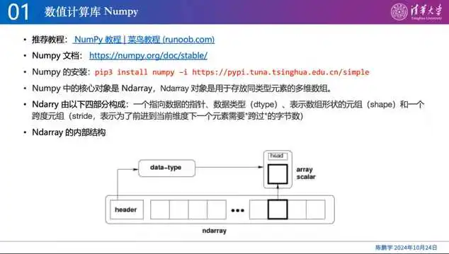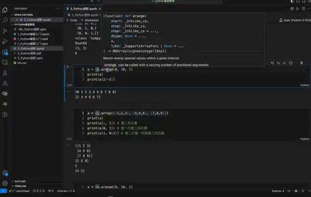 主要介绍了如何获取PPT教程,以及如何在Python中使用NumPy库进行多维数组的创建和操作。NumPy的核心对象是多维数组,包括指向数据的指针、数据类型、数组形状和跨度。通过Numpy提供的array函数可以定义多维数组,也可以使用嵌套列表传递给二维函数。此外,还介绍了如何使用arrange函数进行数组的创建和操作,以及如何指定步长和间隔。