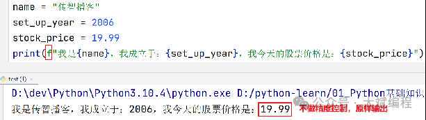 通过语法:f"内容{变量}"的格式来快速格式化