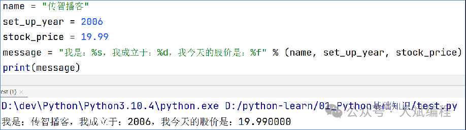 其中,% 表示占位符,且在无需使用变量进行数据存储的时候,可以直接格式化表达式(变量的位置放入表达式),简化代码