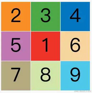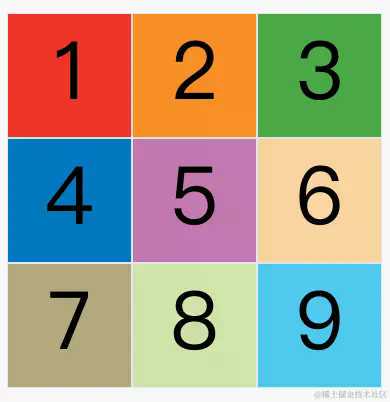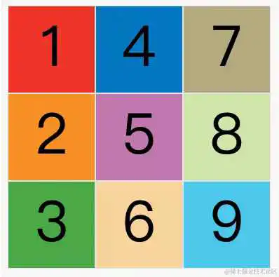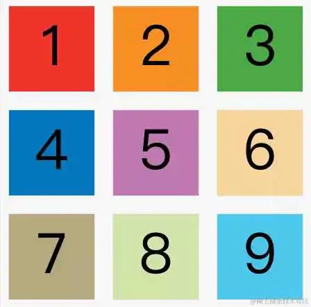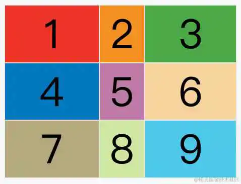 划分网格以后,容器的子元素会按照顺序,自动放置在每一个网格。默认的放置顺序是"先行后列",即先填满第一行,再开始放入第二行,即下图数字的顺序。