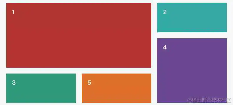 下面的例子让1号项目和2号项目各占据两个单元格,然后在默认的情况下,会产生下面这样的布局。