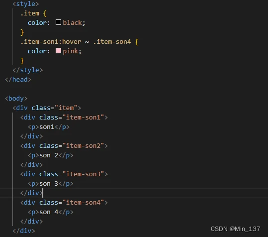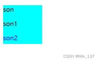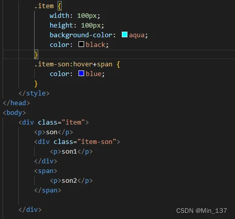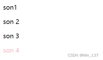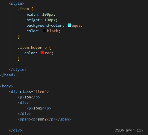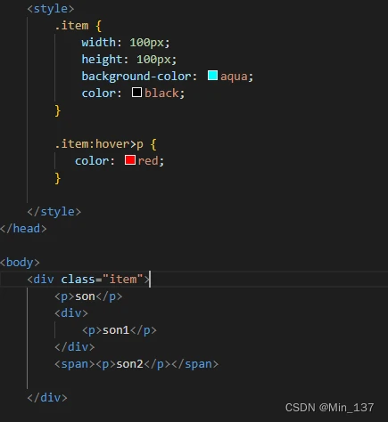 例如:item是父元素,第一个p是其子元素,所以son的字体会标红.(注意:son1和son2外面还包着一层,所以这个是不生效的)