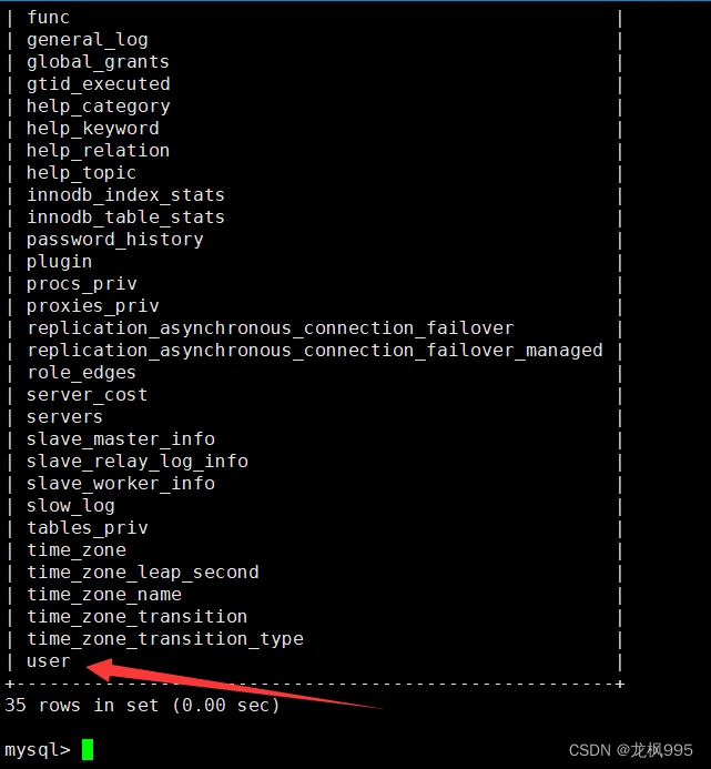 这样的话,就是说,我们连接到了 mysql 数据库,就可以查看 mysql 数据库里的所有表: