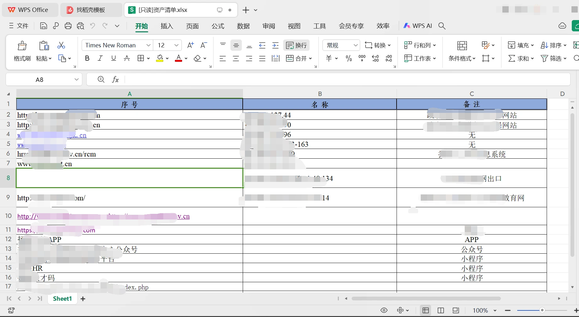 下面这个是我前段时间的一个众测的一个资产表格,有域名、IP然后就是app、web站点、微信小程序等资产。