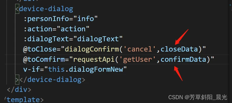 如下面的代码所示,closeData和confirmData分别接收取消和确定时子组件传过来的值