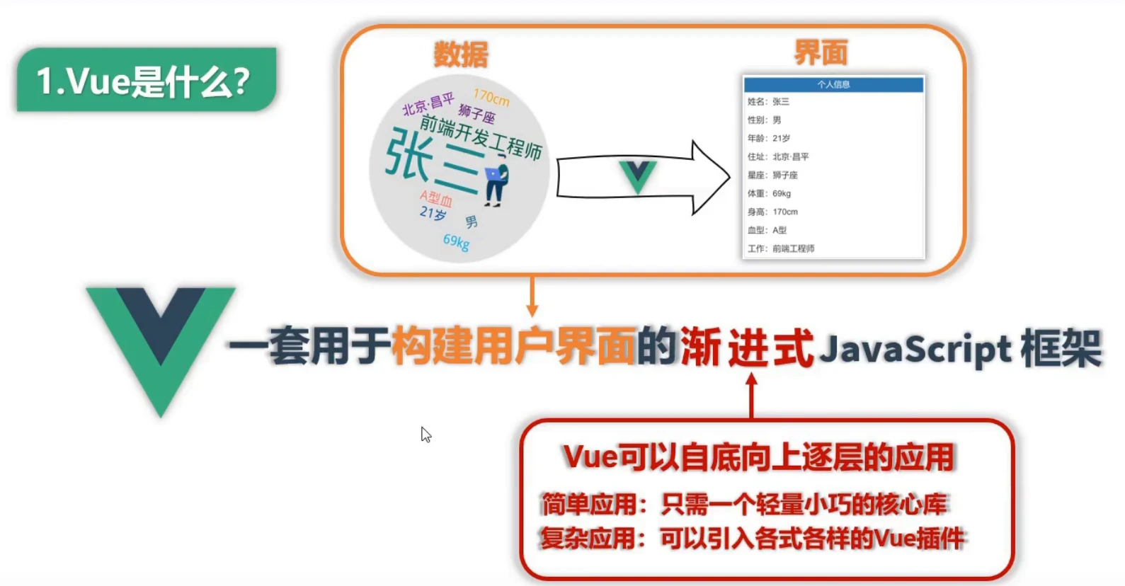 一套用户构建用户界面的渐进式JavaScript框架。