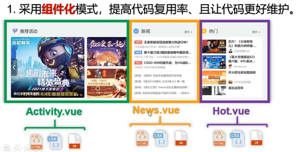 - 真实开发中只有一个Vue实例,并且会配合着组件一起使用