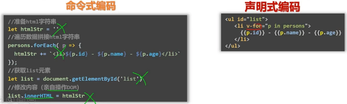 - root容器里的代码依然符合html规范,只不过混入了一些特殊的Vue语法;
