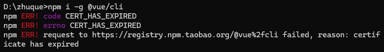 解决安装vue-cli报错:npm ERR! request to https://registry.npm.taobao.org/@vue%2Fcli failed, reason: certificate has expired
