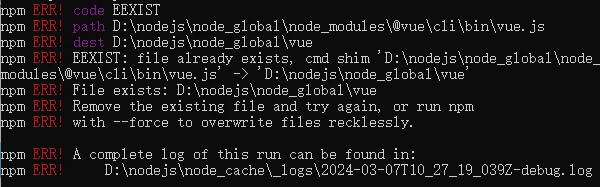 我在重新安装vue2脚手架时,又报了一个错误:npm ERR! code EEXIST npm ERR! path D: odejs ode_global npm ERR! ...