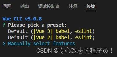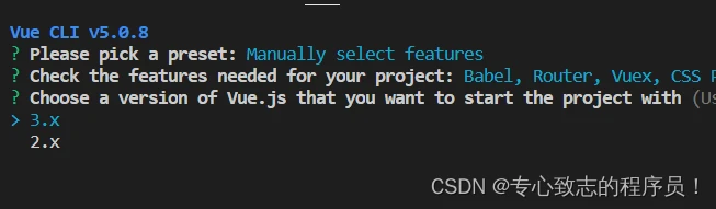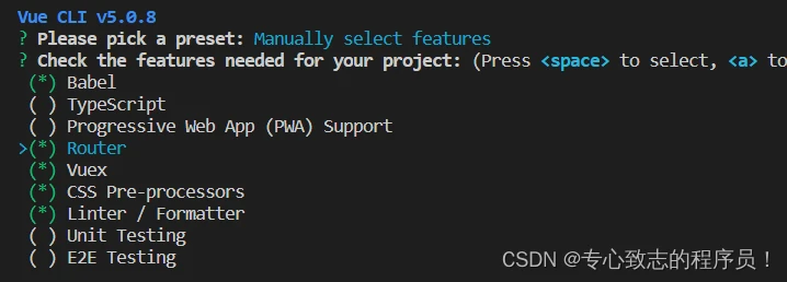 2、选择必用的babel,router,vuex,css功能不要选择(linter)这个选项,从根源上避免ESLint的出现。