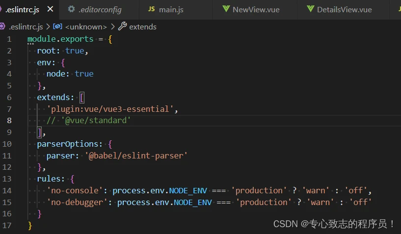 2、打开.eslintrc.js文件找到extends注释掉‘@vue/standard’。