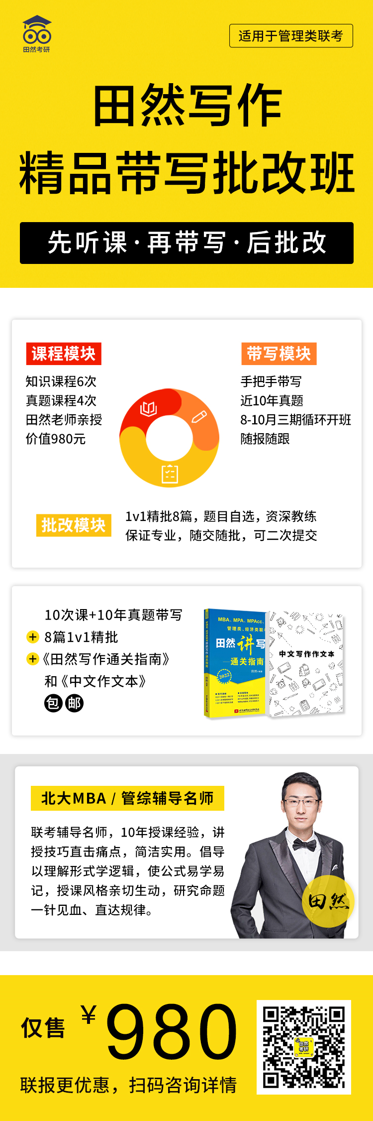 10次20h系统精讲直播课+10年真题带写+8篇1v1精批+包邮送《田然讲写作·通关指南》+《中文写作作文本》。