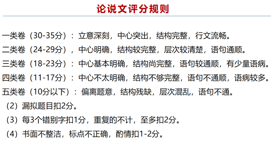写作是比较主观的题目,也是大家日常练习中最难自评的部分。写作除了要考察逻辑思维能力和写作能力,还有一些小细节有评分规则,如字迹、标点规范、错别字等。